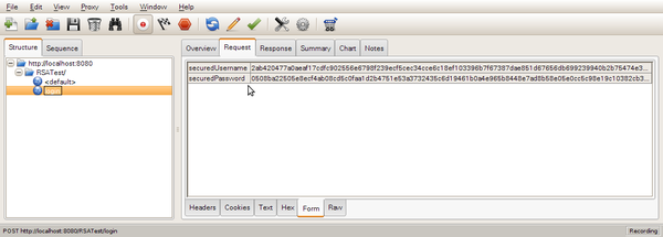 아래 이미지는 실제 전송되는 데이터를 Charles 라는 HTTP 프록시 툴로 살펴본 것이다. 사용자의 ID와 비밀번호가 모두 암호화되어 원형을 알아 볼 수 없음을 볼 수 있다.